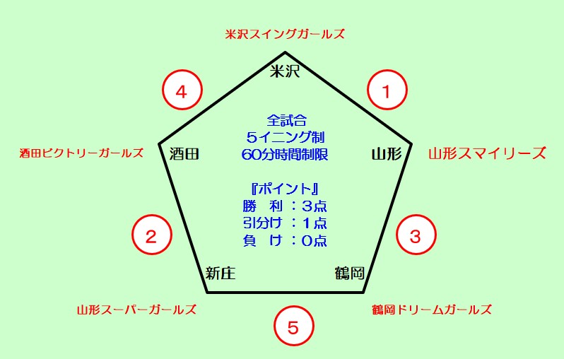 | 5 | 14:00 〜 15:00 | 山形スーパーガールズ | 鶴岡ドリームガールズ |